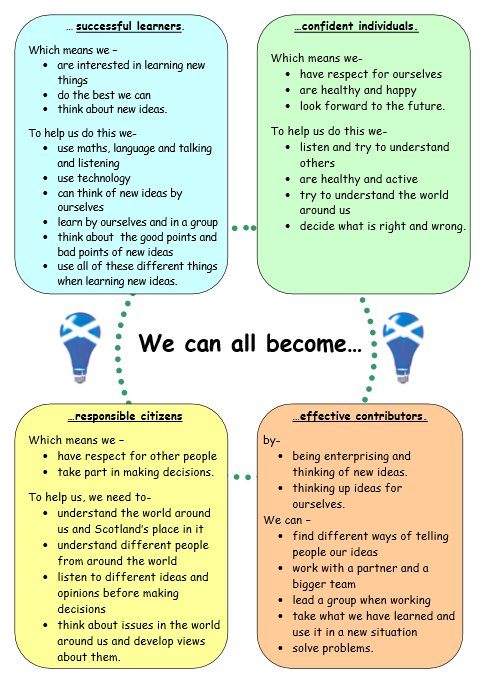 Curriculum for Excellence is a curriculum for children and young people aged 3-18 years, it recognises that children learning through all experiences, in the family and community. The aspiration is that every young child should become Successful Learners, Confident Individuals, Responsible Citizens and Effective Contributors in life.